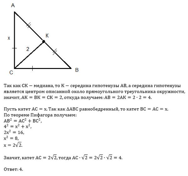 В равнобедренном треугольнике АВС с прямоугольным углом С медиана СК=2 найти длину катета АС умноженную на корень из2