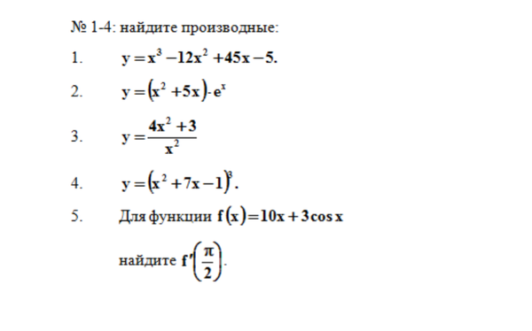 № 1-4: найдите производные: 1. y = x^3 - 12x^2 + 45x - 5. 2. y = (x^2 + 5x) · e^x 3. y = (4x^2 + 3) / x^2 4. y = (x^2 + 7x - 1)^3. 5. Для функции f(x) = 10x + 3 cos x найдите f'(π/2).