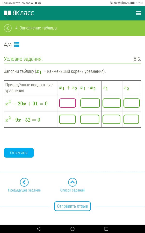Заполни таблицу (x1 - наименьший корень уравнения).