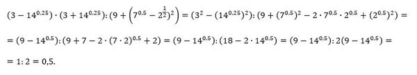 Упростите выражение, пожалуйста Буду очень благодарна) (3-14^(0,25))*(3+14^(0,25)):(9+(7^(0,5)-2^(1/2))^(2))