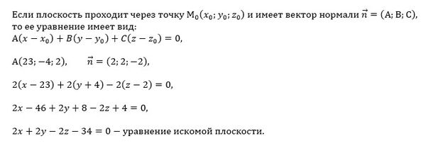 Точка А (23; - 4; 2) принадлежит плоскости а. Вектор нормали этой плоскости n (2; 2;-2) . Запишите общее уравнение плоскости а.
