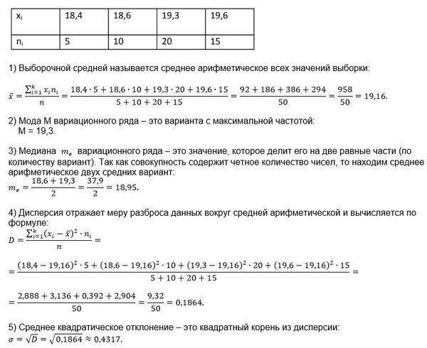 Дано статистическое распределение выборки: xᵢ | 18,4 | 18,6 | 19,3 | 19,6 nᵢ | 5 | 10 | 20 | 15 Определить среднее, моду, медиану, дисперсию и среднее квадратическое отклонение.