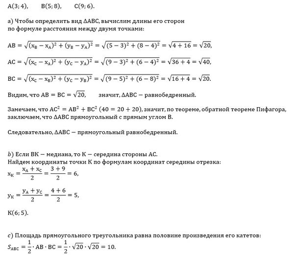 АВ^2 = (0 - 3)^2 + (6 - 9)^2 = (- 3)^2 + (- 3)^2 = 9 + 9 = 18 = 2 * 9;