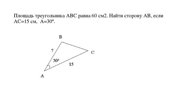 S_( Δ ABC)=(1/2)*AB*AC*sin ∠ BAC 60=(1/2)*AB*15*(1/2) AB=16