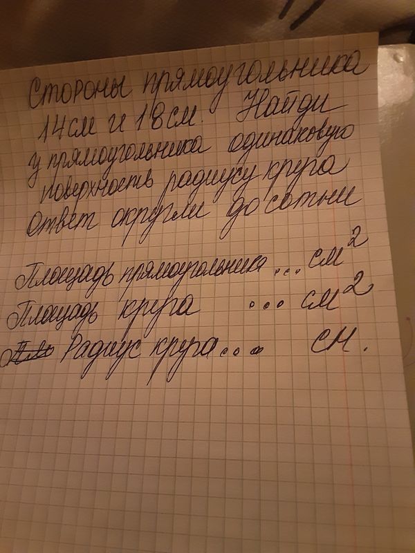 S_(прямоугольника)=14*18=252 cм^2 S_(прямоугольника)= S_(круга) S_(круга)=252 S_(круга)=πR^2 πR^2=252 R^2=[m]\frac{252}{\pi}[/m] R=[m]\sqrt{\frac{252}{\pi}}[/m]