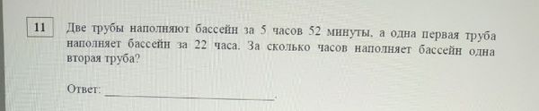 11 Две трубы наполняют бассейн за 5 часов 52 минуты, а одна первая труба наполняет бассейн за 22 часа. За сколько часов наполняет бассейн одна вторая труба?