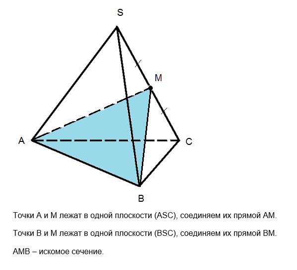Построить сечение тетраэдра ABCS плоскостью, проходящей через сторону AB и точку М - середину ребра SC