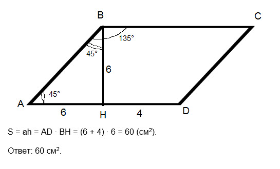тупой угол параллелограмма равен 135 градусов. Высота проведенная из вершины этого угла делит сторону на отрезки 6см и 4см, считая от острого угла .Найдите площадь параллелограмма