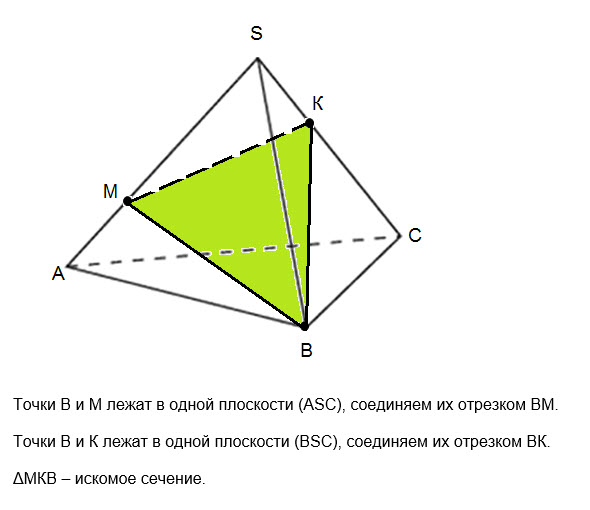 Построить сечение тетраэдра плоскостью, проходящей через точки B, M, K; точка М лежит на ребре SA, точка К лежит на ребре SC