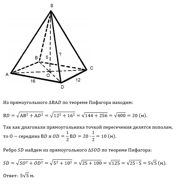 Основанием пирамиды SABCD является прямоугольник со сторонами 12 м и 16 м, точка О – точка пересечения его диагоналей. Высота SO = 5 м. Найдите ребро SD. (Ответ надо дать развернуто с чертежом)