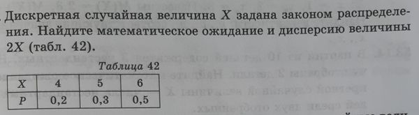 M(2X)=(2*4)*0,2+(2*5)*0,3+(2*6)*0,5=[b]10,6[/b] M(X)=4*0,2+5*0,3+6*0,5=0,8+1,5+3=5,3 M(2X)=2*M(X)=2*5,3=[b]10,6[/b]