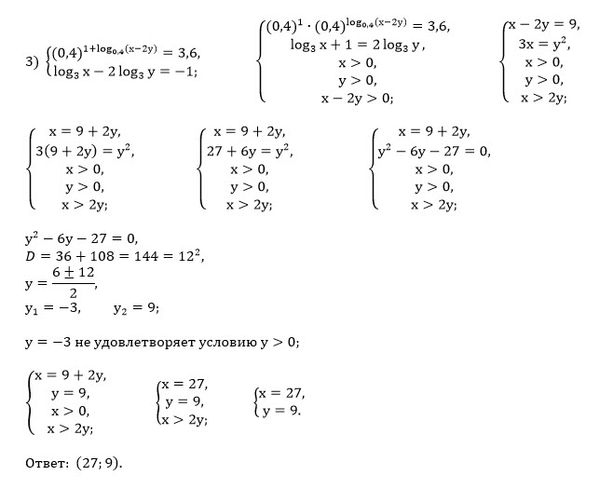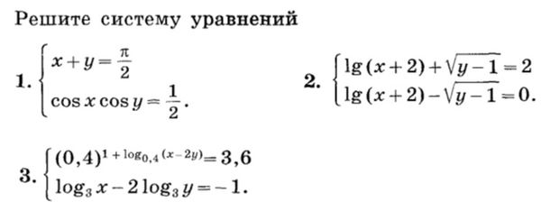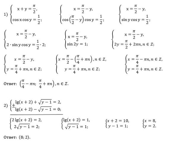 Ребят, решите срочно системы 11 класс. Даю 100 баллов. 1) Система: x+y=п/2 cosx cosy = 1/2 2) Система: lg(x+2)+кореньy-1=2 lg(x+2)-кореньy-1=0 3) Система: (0,4)^1+log0,4^(x-2y)=3,6 log3x-2log3y=-1