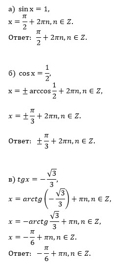 1. a) sin x = 1; б) cos x = 1/2; в) tg x = -√3/3.