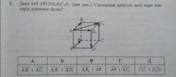 2. Дано куб [m]ABCD A_1B_1C_1D_1[/m] (див. рис.). Скалярний добуток якої пари векторів дорівнює нулю?