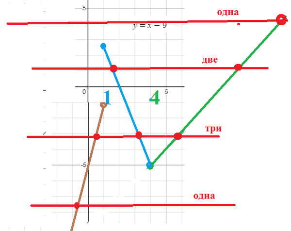 Постройте график функции: {4х–5, если х<1 {–2,5x+5, если 1≤х≤4 {х–9, если х>4 и определите, при каких значениях m прямая y=m имеет с графиком ровно две общие точки.