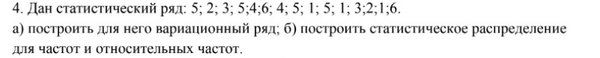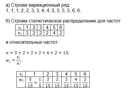 4. Дан статистический ряд: 5; 2; 3; 5; 4; 6; 4; 5; 1; 5; 1; 3; 2; 1; 6. а) построить для него вариационный ряд; б) построить статистическое распределение для частот и относительных частот.