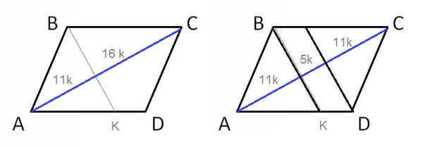 На диагонали АС параллелограмма АВСD взята точка Р так, что АР : СР = 11 : 16. Прямые ВР и АD пересекаются в точке К. Найдите отношение АК : DК.