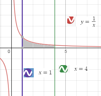 S= ∫ ^(4)_(1)(6/x)dx=(6ln|x|)|^(4)_(1)=6ln4-8ln1=6ln2^2=12ln2
