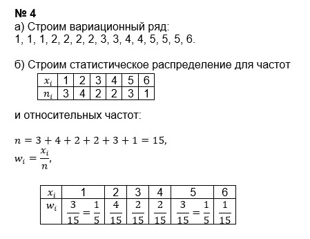 4. Дан статистический ряд: 5; 5; 3; 4;4;6; 2; 5; 1; 2; 1; 3;2;1;2. а) построить для него вариационный ряд; б) построить статистическое распределение для частот и относительных частот.