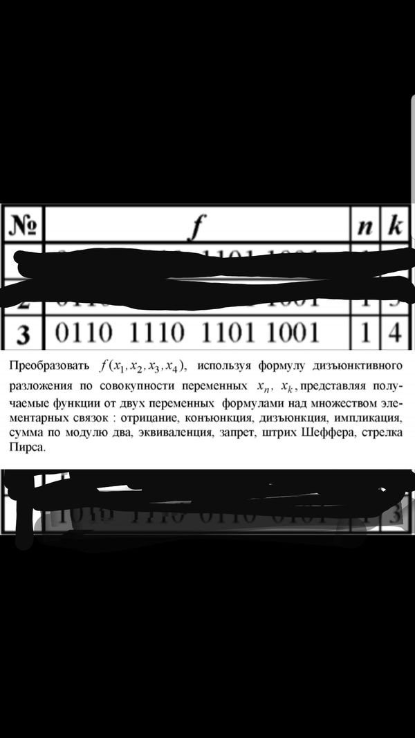 Преобразовать f(x₁, x₂, x₃, x₄), используя формулу дизъюнктивного разложения по совокупности переменных xₙ, xₖ, представляя получаемые функции от двух переменных формулами над множеством элементарных связок: отрицание, конъюнкция, дизъюнкция, импликация, сумма по модулю два, эквиваленция, запрет, штрих Шеффера, стрелка Пирса.