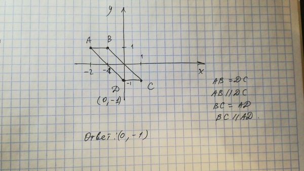y_(O)=(y_(B)+y_(D))/2 ⇒ y_(D)=2y_(O)-y_(B)=2*0-1=-1