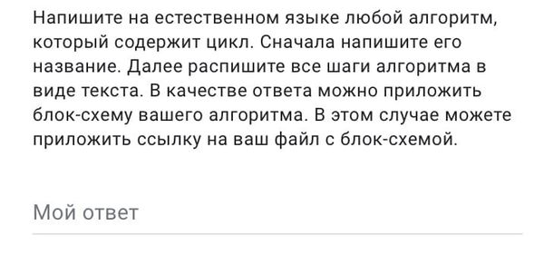 Напишите на естественном языке любой алгоритм, который содержит цикл. Сначала напишите его название. Далее распишите все шаги алгоритма в виде текста. В качестве ответа можно приложить блок-схему вашего алгоритма. В этом случае можете приложить ссылку на ваш файл с блок-схемой.