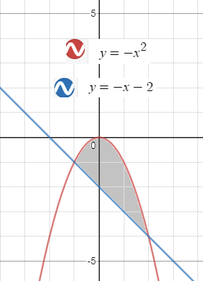 y=-x-2 y=-x^2 -x^2=-x-2 x^2-x-2=0 D=9 x_(1)=-1; x_(2)=2 S= ∫ ^(2)_(-1) (-x^2-(-x-2))dx=((-x^3/3)+(x^2/2)+2x)|^(2)_(-1)=9/2
