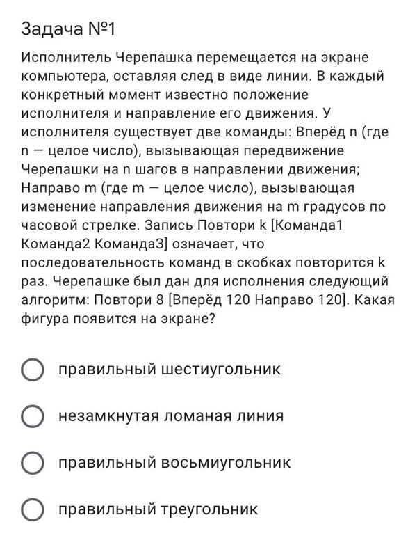 Исполнитель Черепашка перемещается на экране компьютера, оставляя след в виде линии. В каждый конкретный момент известно положение исполнителя и направление его движения. У исполнителя существует две команды: Вперёд n (где n — целое число), вызывающая передвижение Черепашки на n шагов в направлении движения; Направо m (где m — целое число), вызывающая изменение направления движения на m градусов по часовой стрелке. Запись Повтори k [Команда1 Команда2 Команда3] означает, что последовательность команд в скобках повторится k раз. Черепашке был дан для исполнения следующий алгоритм: Повтори 8 [Вперёд 120 Направо 120]. Какая фигура появится на экране?