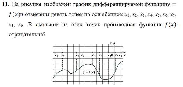 11. На рисунке изображён график дифференцируемой функции y = f(x) и отмечены девять точек на оси абцисс: x₁, x₂, x₃, x₄, x₅, x₆, x₇, x₈, x₉. В скольких из этих точек производная функции f(x) отрицательна?
