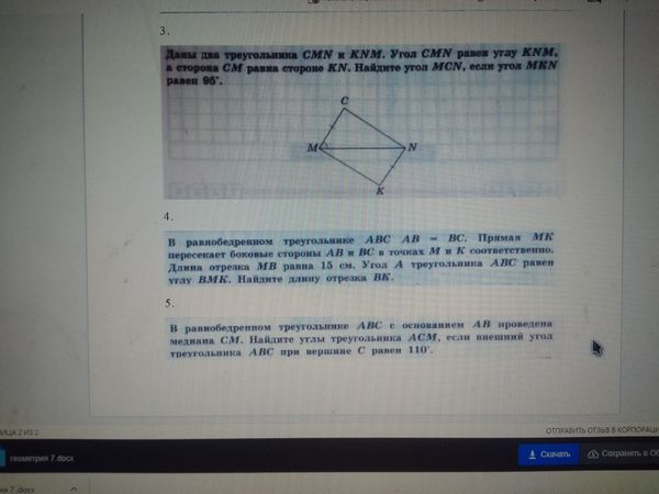 3. Даны два треугольника CMN и KNM. Угол CMN равен углу KNM, а сторона СМ равна стороне KN. Найдите угол MCN, если угол MKN равен 95°.