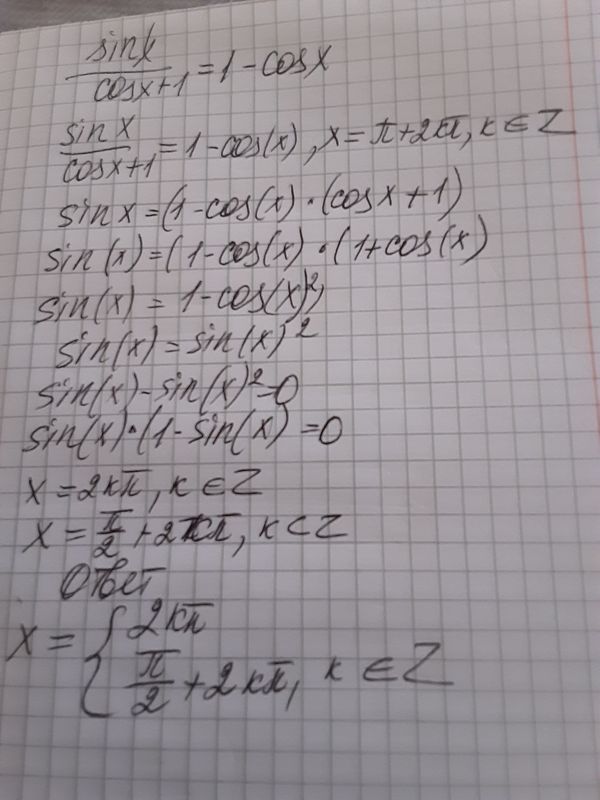 Учитывая для х=πк , что х ≠ π+2πn , получаем х=2πк
