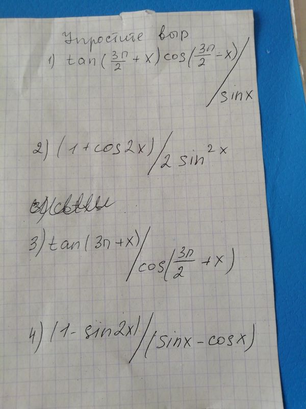 1) tan(3π/2 + x)cos(3π/2 - x)/sinx 2) (1 + cos2x)/2sin^2x 3) tan(3π + x)/cos(3π/2 + x) 4) (1 - sin2x)/(sinx - cosx)