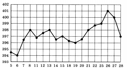 На рисунке жирными точками показана цена унции золота на момент закрытия биржевых торгов во все рабочие дни с 5 по 28 марта 1996 года. По горизонтали указываются числа месяца, по вертикали — цена унции золота в долларах США. Для наглядности жирные точки на рисунке соединены линией. Определите по рисунку наименьшую цену золота на момент закрытия торгов в указанный период (в долларах США за унцию).