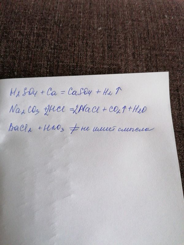 Н2SO4 + Са = CaSO4 + H2 Na2CO3 + 2HCl = 2NaCl + CO2 + H2O BaCl2 + HNO3 = не идет