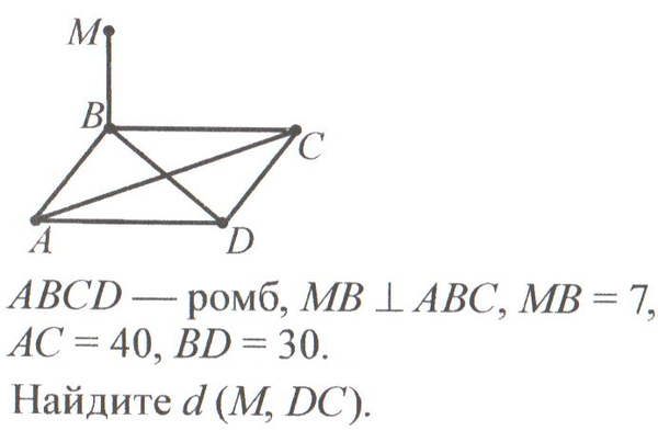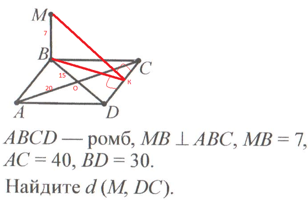 Т.к. наклонная МК ⊥ DC, то и проекция ВК⊥ DC. Значит ВК-высота ромба.Диагонали ромба взаимно перпендикулярны и точкой пересечения делятся пополам. Из ΔАВО-прямоугольного найдем гипотенузу ( сторону ромба)т АВ=√( 15²+20²)=25.