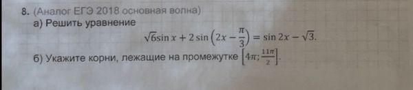 8. (Аналог ЕГЭ 2018 основная волна) а) Решить уравнение √6sinx + 2 sin(2x - π/3) = sin 2x - √3. б) Укажите корни, лежащие на промежутке [4π; 11π/2].