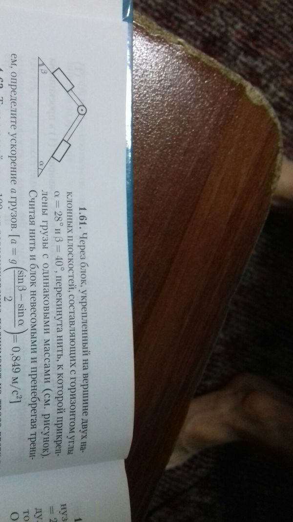 Через блок, укрепленный на вершине двух наклонных плоскостей, составляющих с горизонтом углы а = 28° и B = 40°, перекинута нить, к которой прикреплены грузы с одинаковыми массами (см. рисунок). Считая нить и блок невесомыми и пренебрегая трением, определите ускорение а грузов.