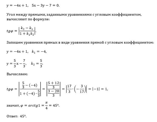 2.1 Найти угол между прямыми y = -4x + 1 и 5x - 3y - 7 = 0,