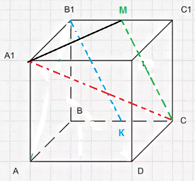 Дан куб АВСДА1В1С1Д1. Точка К середина стороны ВС. Найти угол между прямыми А1С, В1К.