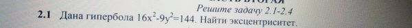 Делим на 144 [m]\frac{16x^2}{144}-\frac{9y^2}{144}=1[/m] [m]\frac{x^2}{9}-\frac{y^2}{16}=1[/m] a^2=9; b^2=16 b^2=c^2-a^2 ⇒ c^2=b^2+a^2=16+9=25 ε =c/a=5/3