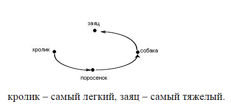 Построить граф отношения «легче, чем» на множестве A = {кролик, заяц, собака, поросёнок}, если известно, что заяц тяжелее собаки, кролик легче поросёнка, а собака тяжелее поросёнка. Кто из животных самый легкий, кто – самый тяжелый.