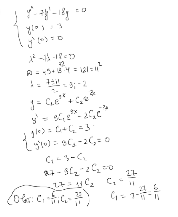 2.2 Найдите значение произвольных постоянных при решении задачи Коши для линейного дифференциального уравнения с постоянными коэффициентами: y'' - 7y' - 18y = 0, y(0) = 3, y'(0) = 0