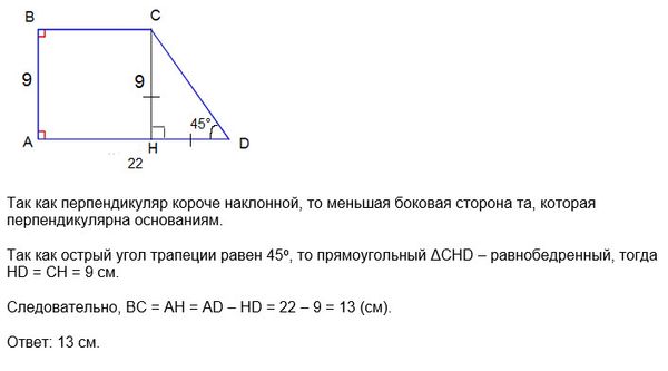 В прямоугольной трапеции острый угол равен 45°. Меньшая боковая сторона равна 9 см, а большее основание равно 22 см. Вычисли длину меньшего основания.