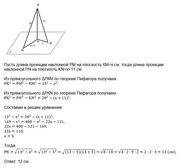 из точки P к плоскости бетта проведены две наклонные PM и PN и перпендикуляр PK. Найдите длину перпендикуляра PK, если PM=13см, PN=20см, а длина проекции наклонной PM меньше длины проекции наклонной PN на 11см