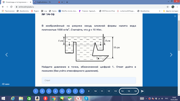 №14-16 В изображённый на рисунке сосуд сложной формы налита вода плотностью 1000 кг/м³. Считайте, что g = 10 Н/кг. Найдите давление в точке, обозначенной цифрой 1. Ответ дайте в паскалях (без учёта атмосферного давления). Ответ