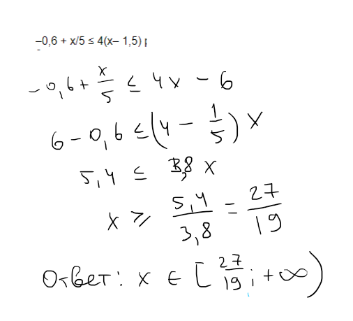 -0,6 + x/5 ≤ 4(x- 1,5) решить неравенство. Помогите пожалуйста решить. Класс 8