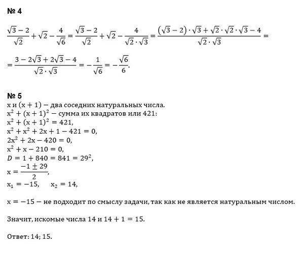 4. Упростите выражение: (√3-2) / √2 + √2 - 4 / √6. 5. Найдите два соседних натуральных числа, сумма квадратов которых равна 421.