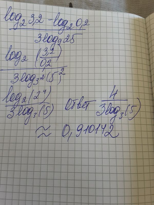 log_(2)3,2-log_(2)0,2=log_(2)[m]\frac{3,2}{0,2}[/m]=log_(2)16=log_(2)2^(4)=4*log_(2)2=4*1=4 3^(log_(9)25)=3^(log_(9)5^2)=3^(2log_(9)5)=(3^2)^(log_(9)5)=9^(log_(9)5)=5 - основное логарифмическое тождество О т в е т 4/5=0,8