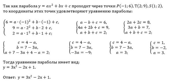 Запиши уравнение параболы [m] y = ax^2 + bx + c [/m], если известно, что она проходит через точки P(-1;6), T(2;9) и S(1;2).