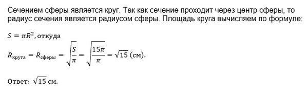Площадь сечения, проходящего через центр сферы 15π см2 равна. Какой радиус сферы?